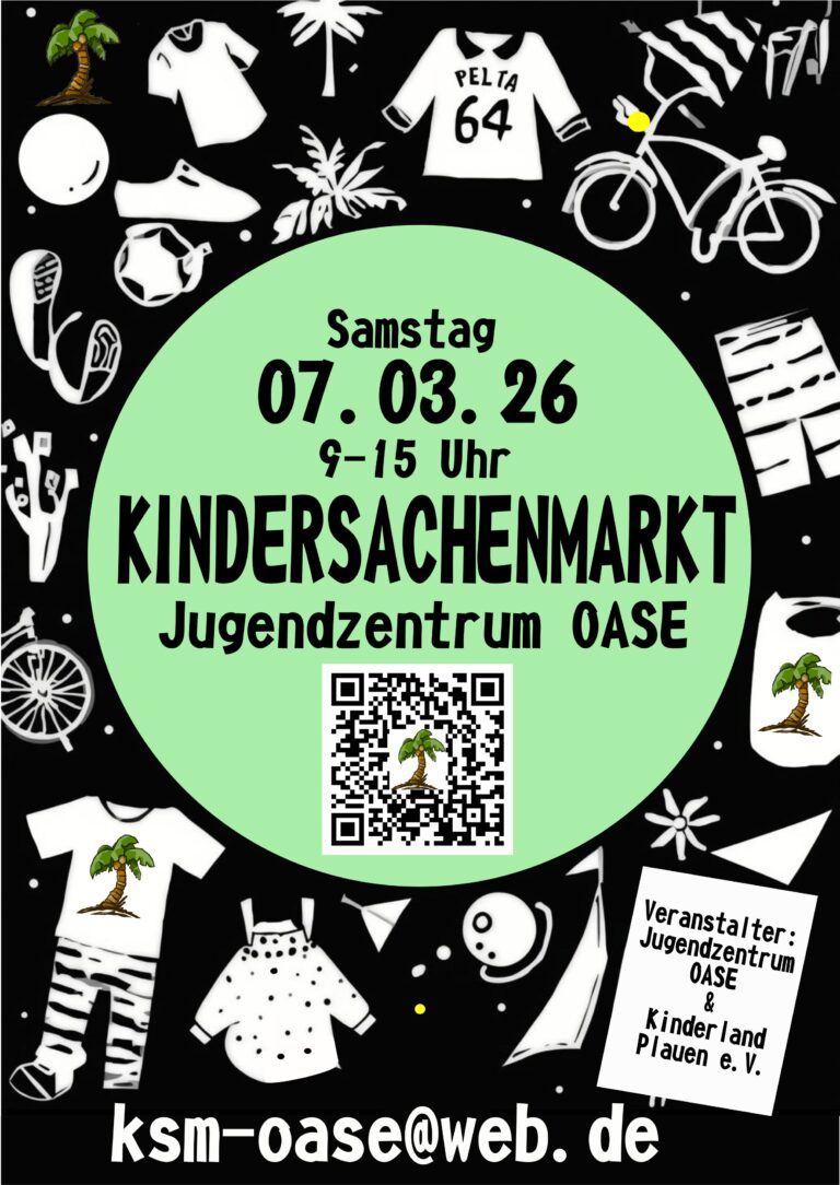 Der kommende Kindersachenmarkt findet am 7. März 2026 von 9.00 bis 15.00 Uhr im Jugendzentrum Oase statt.